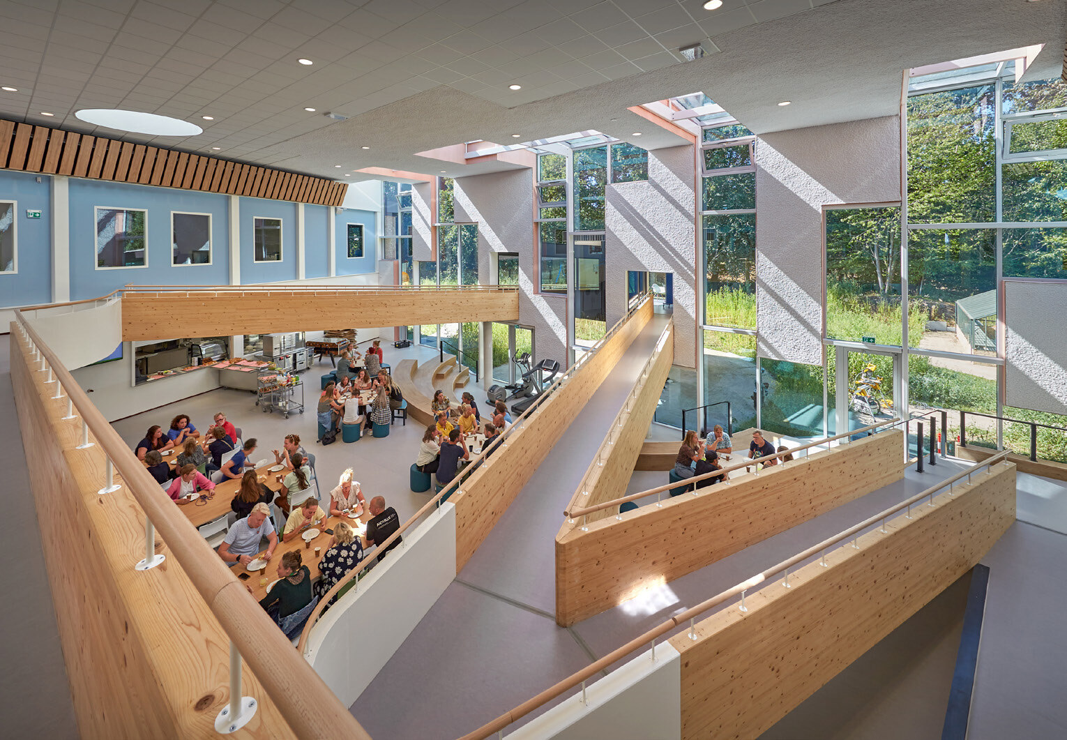 In het Prisma College in Arnhem vormt een hellingbaan het speelse middelpunt van de centrale hal. De hellingbaan verbindt twee verdiepingen en is zowel functioneel als symbolisch. Architect Erik Wiersma: ’We zien die hellingbaan als het vieren van de zelfredzaamheid. Alle leerlingen kunnen elkaar spelenderwijs helpen in een veilige omgeving die zelfvertrouwen stimuleert.’ Foto: Bert Rietberg